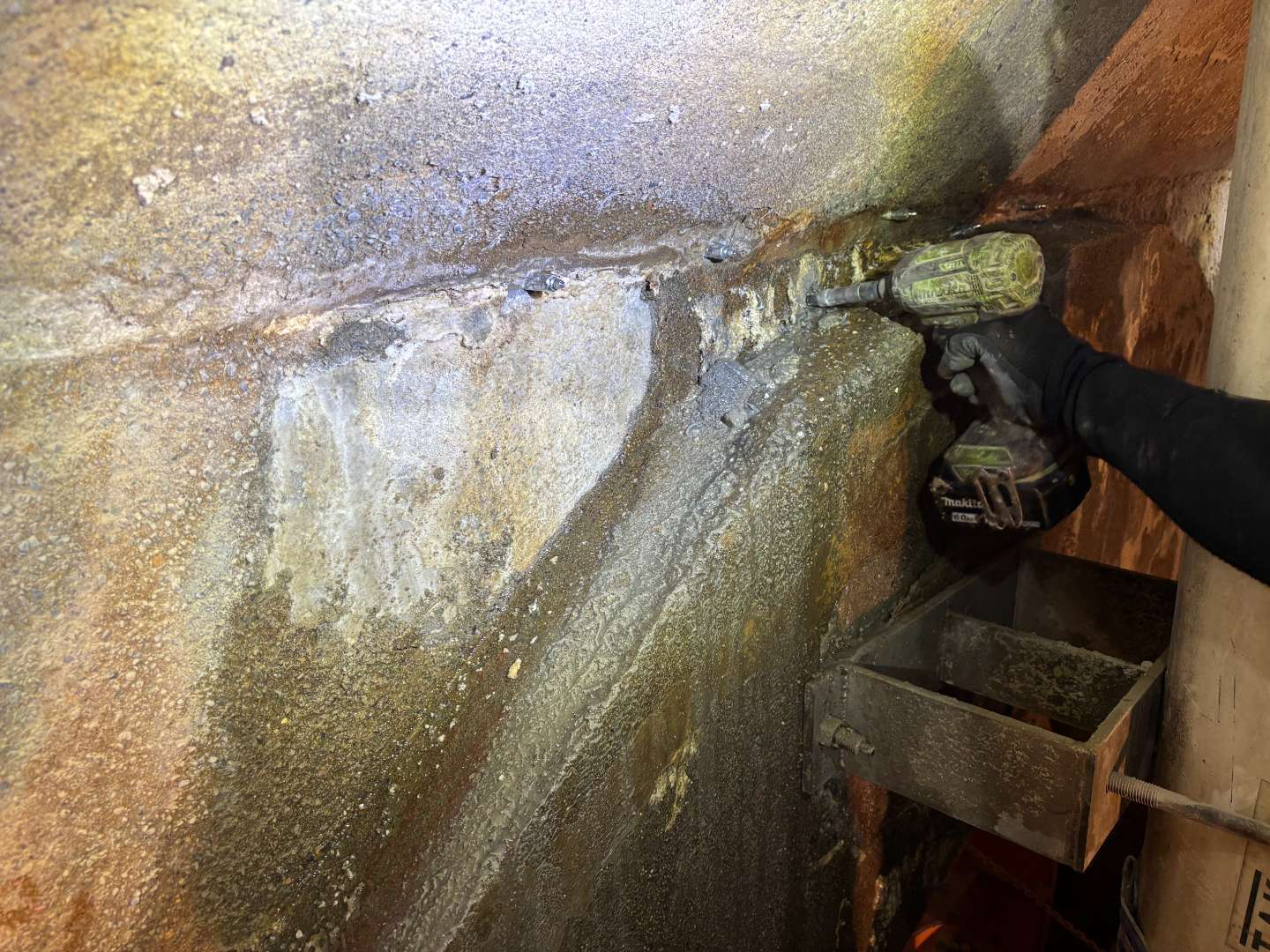 『バンデフレキシン』工法は極めて低粘度のアクリル系二成分合成樹脂をコンクリートの漏水部分に専用注入機を用いて高圧で注入する工法です。この工法はコンクリートの漏水部に約45度の角度で削孔し、専用の特殊ノズルで親水性の注入剤を常に規定量だけ圧入できる注入機で、打継ぎ部、ひび割れ部、エキスパンジョイント部、豆板へ隙間全体に充填させることができます。