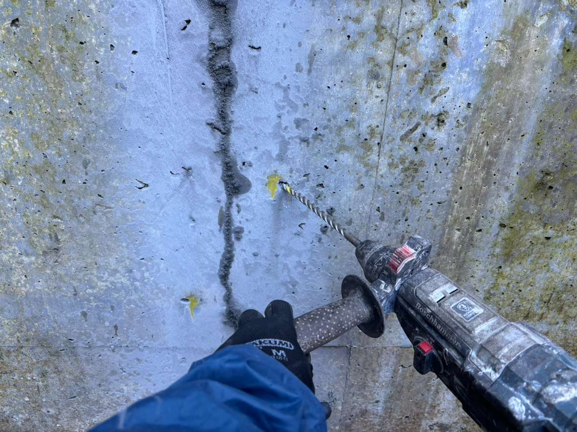 注入孔として電動ドリルで直径10~20mmの孔をあけます。専用注入機にあわせた特殊ノズルでバンデフレキシン薬液を注入し、完了したらノズルを取り除き、注入孔を急結セメントで充填します。