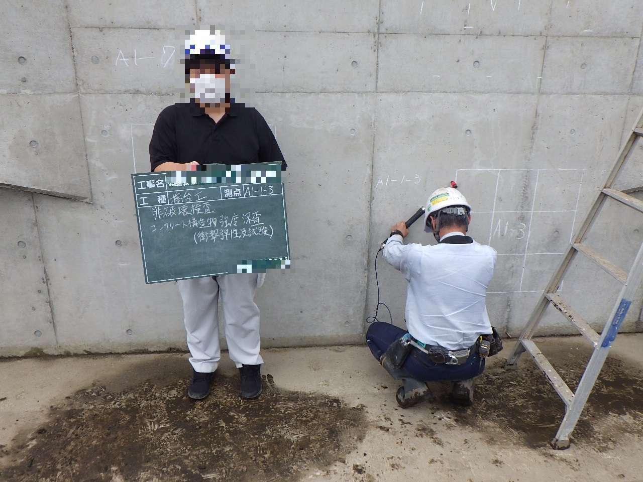 本試験はコンクリート構造物内の配筋状態及びかぶりを非破壊試験によって測定・間隔および感振方向が固定された2個の加速度センサーを用いて衝撃弾性波の位相速度(伝播速度)を測定し、所要の規格値、施工精度を有しているかの確認をする調査を行いました。