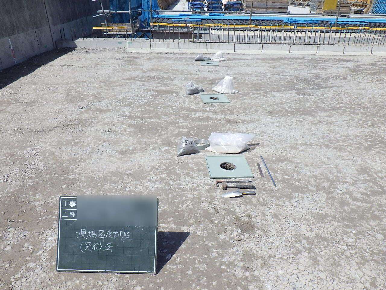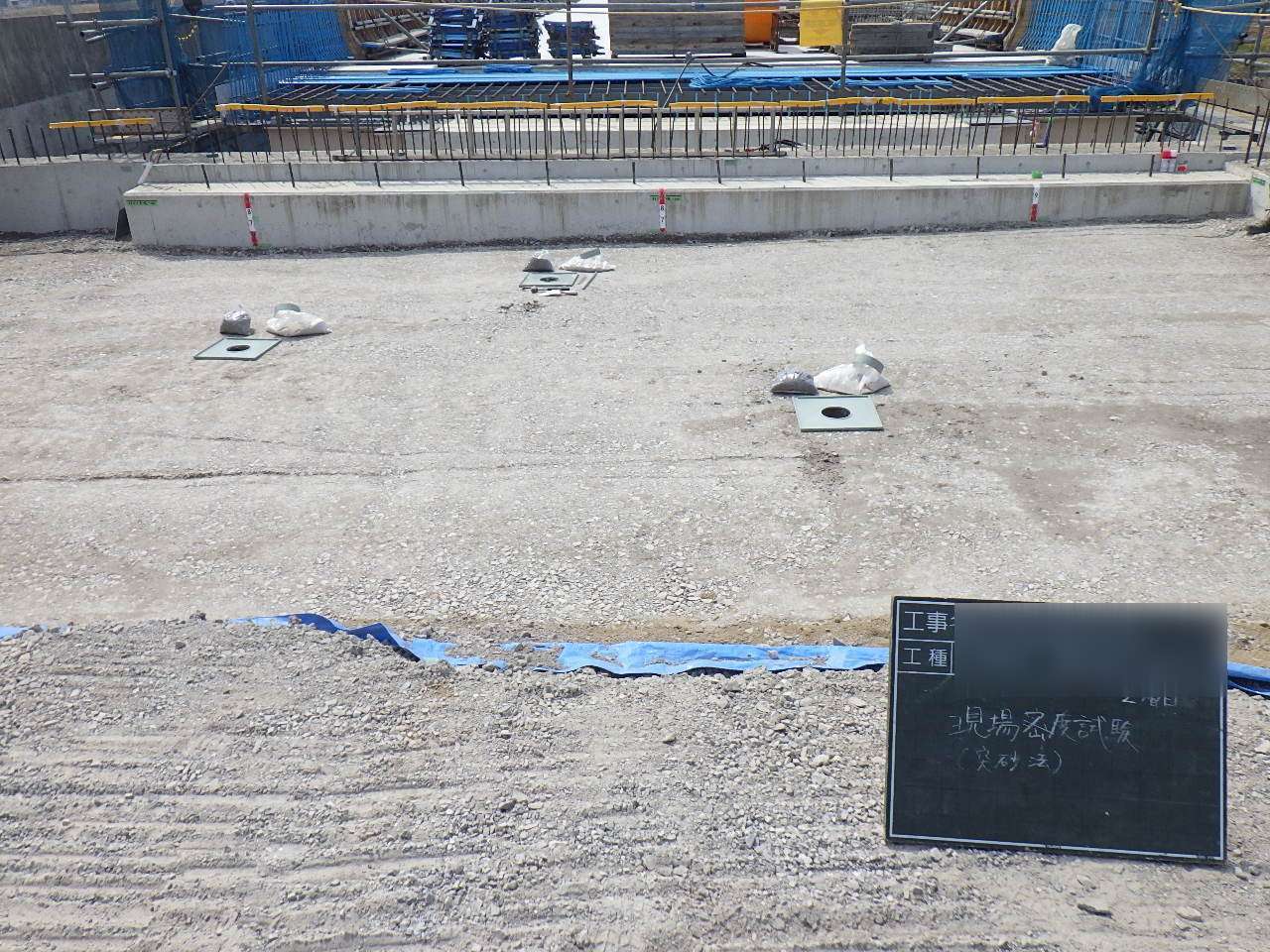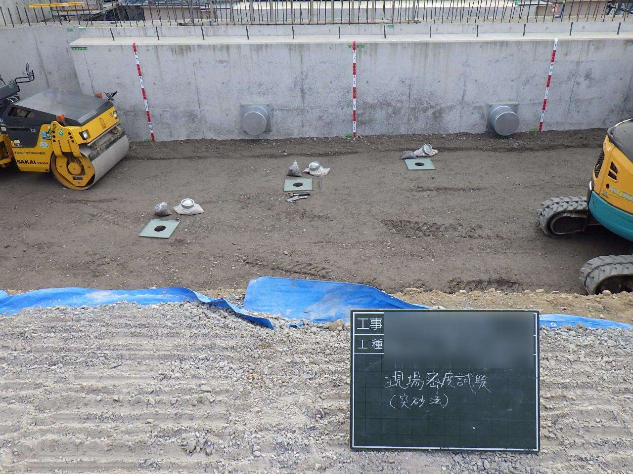地盤の締固め度や密度を確認するための原位置試験方法のひとつです。小型の円筒容器に一定量の砂を入れておき、容器の下部を地盤上に押し付けて砂を突き落とし、落ちた砂が容器下部の円形部分を満たす体積から、現況土の地盤がどの程度締固められているかを測定する試験を行いました。